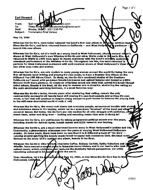 I presented my idea to West Hollywood City Councilmember Steve Martin that the City of West Hollywood mark the return of the reunited Go-Go's by issuing an official proclamation, becoming the only city in the world to do so!!! I had the extreme honor of writing this proclamation. You can view it by clicking here.
